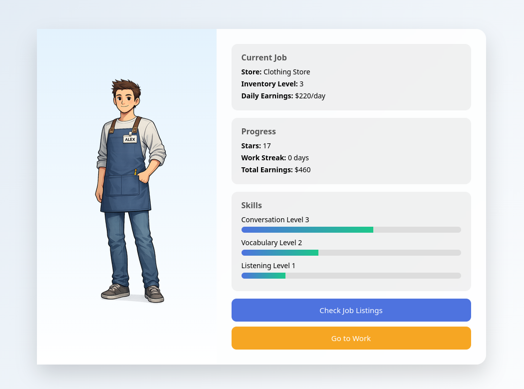 O Job Simulation Game já está na versão 1.6 e o jogador tem bastante conteúdo para treinar o inglês vivenciando um trabalhador na gringa. Você escolhe seu trampo e tenta dialogar com os clientes para servi-los. Não deixe sua energia baixar demais se não seu gerente pode te notificar e não te deixar trabalhar.